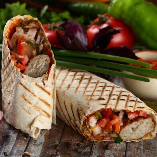 Обжаренное на мангале мясо курочки в лаваше, приправленное овощами и соусами