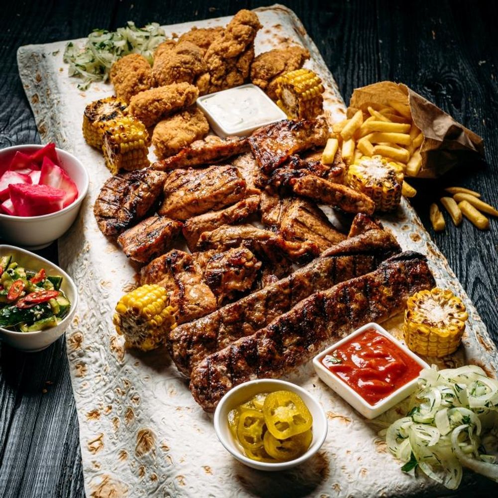 Выход мяса в сыром виде: 1,4 кг (Целый килограмм шашлыка из свиной лопатки, люля-кебаб из курочки) 7 аппетитных куриных крылышек в пикантной, хрустящей панировке, картошка фри, соусы, битые огурцы по-китайски, кукуруза, маринованная капуста по-кавказски, лаваш, маринованный лук