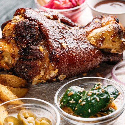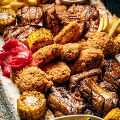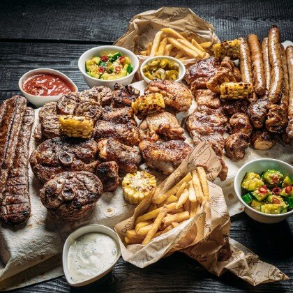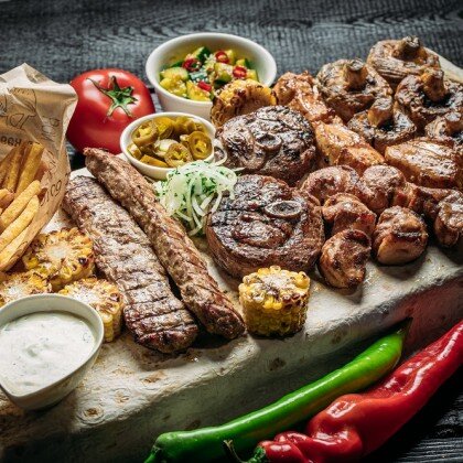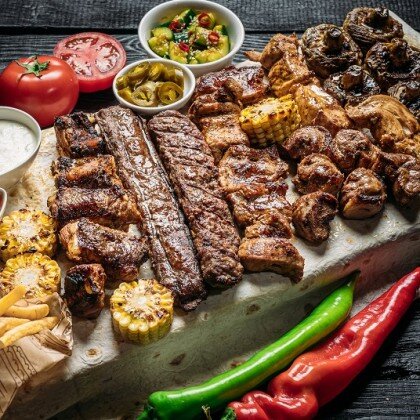 Выход мяса в сыром виде: 1,4 кг (Целый килограмм свиной шейки, люля-кебаб из курочки) 7 аппетитных куриных крылышек  в пикантной, хрустящей панировке, картошка фри, соусы, битые огурцы по-китайски, кукуруза, маринованная капуста по-кавказски, лаваш, маринованный лук