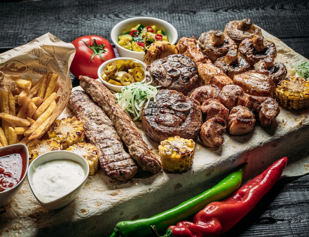 Полтора кило шашлыков (утка, люля-кебаб из курочки, стейк из голени индейки, филе курочки, шампиньоны) картошка фри, кукуруза, соусы, битые огурцы по-китайски, лаваш, маринованный лук, халапеньо