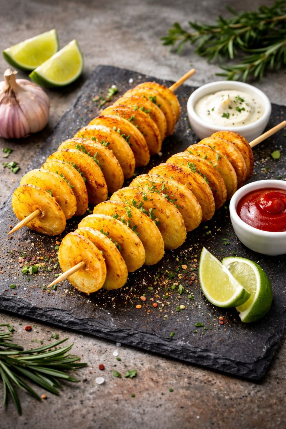 эффектная спиральная нарезка картофеля на шпажке, обжаренная до золотистой хрустящей корочки, с нежной мякотью внутри