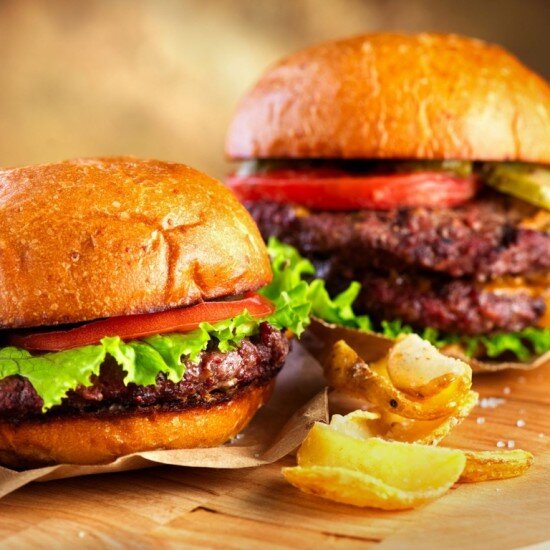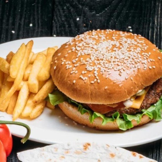 Говяжья котлета, жаренный лук, сыр чеддер, помидор, лист салата, соус терияки