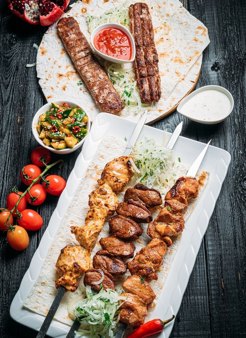 Выход мяса в сыром виде 0,95кг(свиная шейка, курочка, утка, люля-кебаб куриный и говяжий), соусы, битые огурцы по-китайски, маринованный лук, лаваш