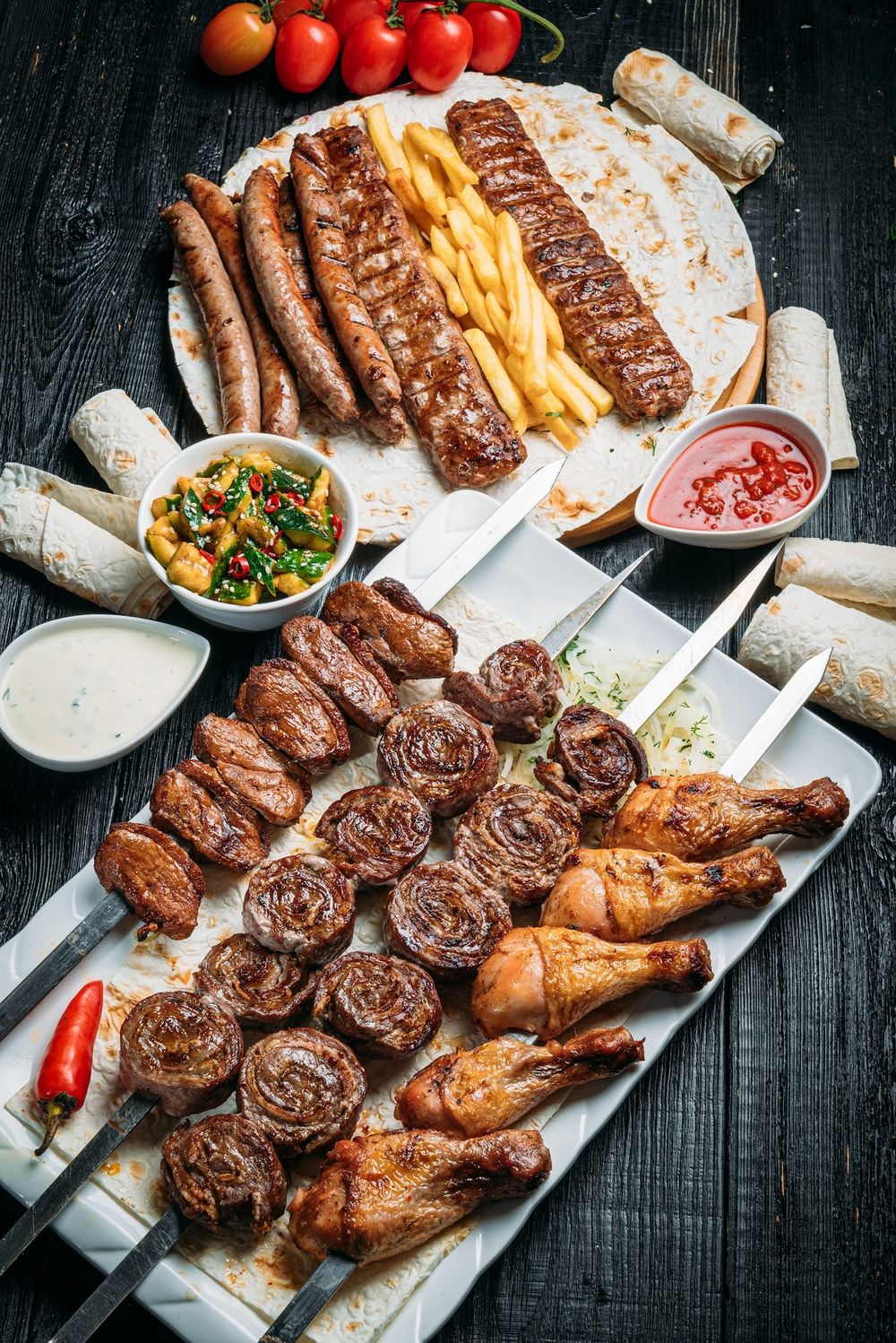 Выход мяса в сыром виде 2,1кг(рулетики из говяжьего фарша с курдюком, колбаски куриные, утка, люля-кебаб из курочки, люля-кебаб из говядины, куриная голень), соусы, битые огурцы по-китайски, лаваш, маринованный лук