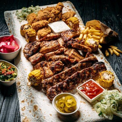 Сет для горячей вечеринки: шашлыков хватит на десятерых. Выход мяса в сыром виде 3,5кг(рулетики из говяжьего фарша с курдюком, колбаски куриные, утка, люля-кебаб из курочки, люля-кебаб из говядины, куриные бёдрышки, свинина, свиные ребрышки, стейк из голени индейки) картошка фри, кукуруза, соусы, битые огурцы по-китайски, лаваш, маринованный лук, халапеньо